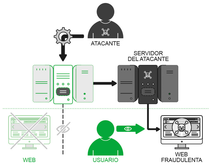 Esta táctica de phising se conoce más como Pharming. Los cibercriminales manipulan los archivos hosts de una empresa o el sistema de nombres de dominio de la misma, para que las solicitudes de URL devuelvan una dirección falsa y las comunicaciones sean dirigidas a un sitio web falso.