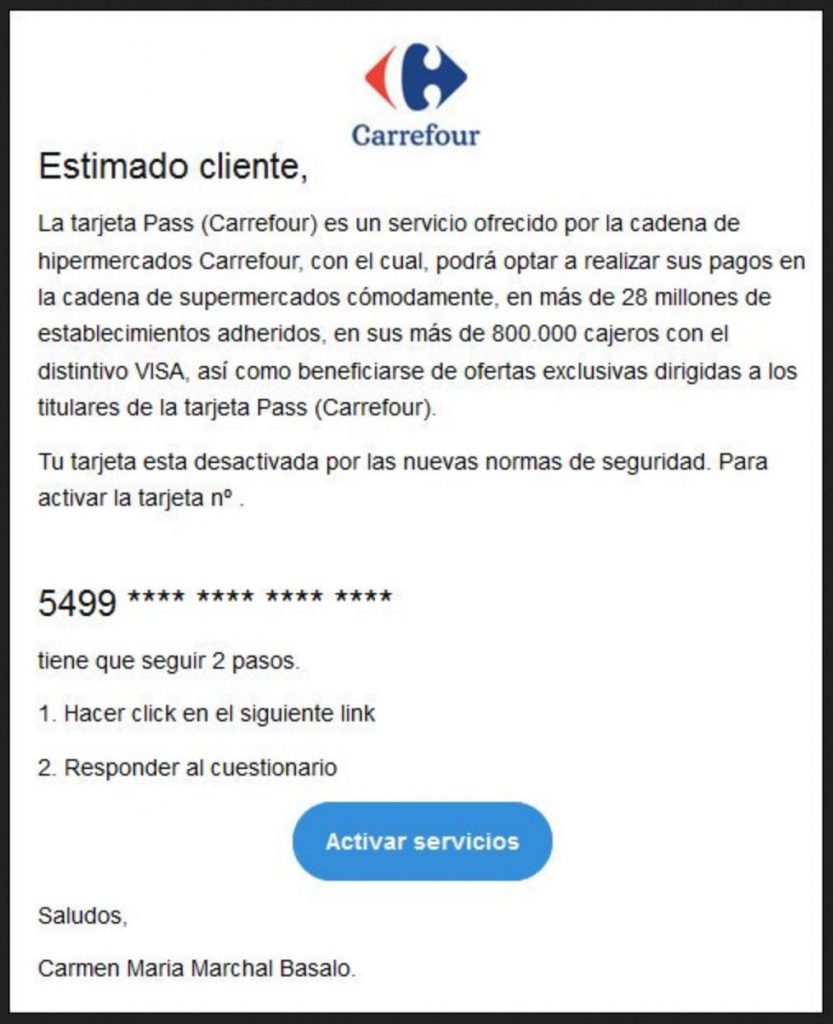 El siguiente es un ejemplo de un ataque reciente a los clientes de Carrefour, donde se les pide que activen su tarjeta Pass.